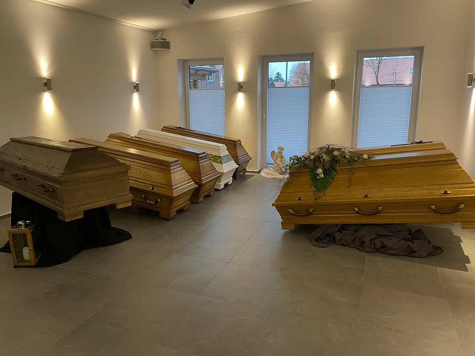 Wir verfügen über zwei Abschiedsräume, in denen sie in aller Ruhe Abschied von ihren geliebten Menschen nehmen können. Das "Haus der Engel" verfügt über eine Trauerhalle, die 80 Sitzplätze bietet. Zudem bieten wir eine Cafeteria bis zu 40 Personen an.